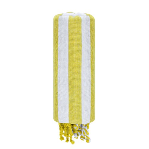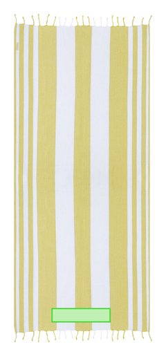 Suave pareo-toalla de 180g/m2 en combinación de Algodón Reciclado y Poliéster RPET. Su diseño cuenta con una base en color y rayas blancas. Incluye flecos en los extremos que añaden un detalle decorativo y que completan su acabado.