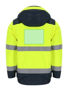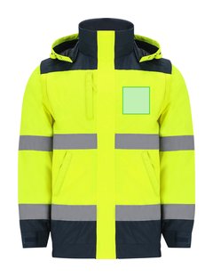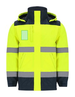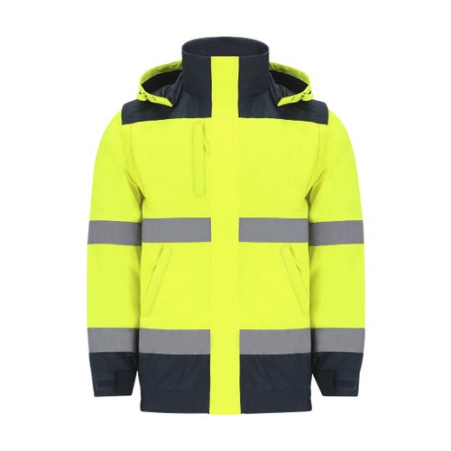 Chaqueta acolchada de alta visibilidad con diseño bicolor. Confeccionada en tejido exterior impermeable y costuras termoselladas, ofrece protección contra el viento y la lluvia.Con dos bandas reflectantes horizontales en el cuerpo y dos en las mangas, que aseguran una visibilidad óptima en condiciones de baja luminosidad.Incluye capucha enrollable, cierre frontal con cremallera y solapa con velcro. así como puños ajustables y cintura elástica para mayor ajuste.Cuenta con dos bolsillos laterales con cierre de cremallera, un bolsillo en el pecho derecho y un bolsillo interior con cierre de cremallera.Incorpora acceso trasero interior para reprocesos o personalización.