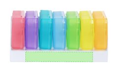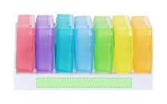 Pastillero semanal en resistente PP. Incluye 7 compartimentos individuales, cada uno identificado por un color y las siglas correspondientes al día de la semana, facilitando su uso. Cada compartimento está dividido en 2 casillas independientes, ideales para separar las dosis de la mañana, la tarde o noche.