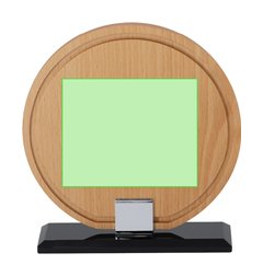 Placa trofeo con diseño redondo fabricada en madera con base en vidrio. Unida mediante pieza metálica plateada. Ideal para regalos personalizados, reconocimientos, premios y decoración.