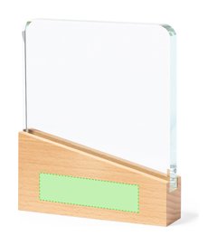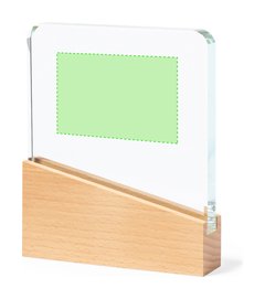 Placa conmemorativa fabricada en cristal grueso y resistente, con base en madera natural. Presentada en estuche de protección kraft, con cierre magnético y espuma interior.