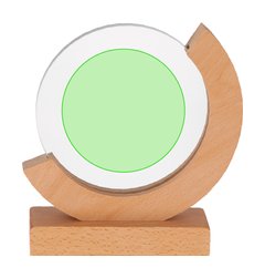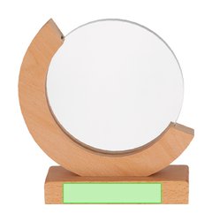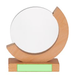 Placa trofeo de grueso cristal con elegante diseño circular con base en madera. Ideal para regalos personalizados, reconocimientos, premios y decoración. Presentada en estuche de protección individual en acabado Kraft.