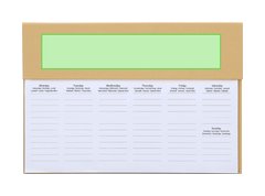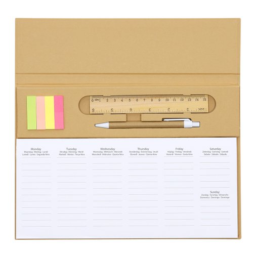 Planificador semanal de mesa. Disponible en 7 idiomas (español, inglés, francés, portugués, alemán, neerlandés, italiano). Incluye: - 125 hojas para planificación semanal - 25 notas adhesivas medianas y 100 mini-notas adhesivas en diferentes colores - Bolígrafo de de mecanismo pulsador, cuerpo en cartón reciclado y tinta azul - Regla de madera - Tapa rígida en cartón reciclado - Lámina protectora de plástico El cartón reciclado proviene del reaprovechamiento de excedente de fabricaciones y reciclaje de papel en el final de su vida útil, convirtiéndose en un lienzo ecológico y sostenible.