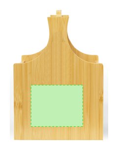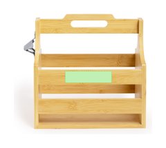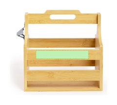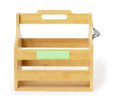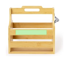 Práctico soporte para botellas hecho en bambú. Original caja de transporte de bebidas con asa troquelada en la parte superior y un abridor de botellas metálico en un lateral, con capacidad para 6 botellines. Presentado en caja de diseño kraft.