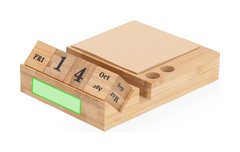 Portanotas calendario perpetuo con soporte, fabricado en bambú. Este elegante calendario perpetuo está compuesto por cubos que indican los días de la semana, los meses y los días del mes. Incluye soporte para smartphone, 100 notas adhesivas de papel kraft y soporte para dos bolígrafos. Perfecto para mantener tu escritorio organizado y estilizado.Materiales como el Bambú fomentan la utilización de materias primas naturales reduciendo las emisiones contaminantes. Además, el Bambú proviene de una planta de gran resistencia y versatilidad, con crecimiento y regeneración rápida, siendo una excelente alternativa al uso de madera tradicional.