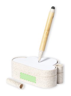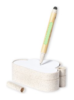 Portanotas semillas de línea nature con original diseño nube. Incluye: Bloc de 80 notas blancas en forma de nube. Base con soporte para bolígrafo y dos compartimentos, con hoja de papel semilla incluida. Fabricado en caña de trigo, para así fomentar la utilización de materias primas naturales y reducir las emisiones contaminantes. Bolígrafo puntero con cuerpo fabricado en bambú; capucha y detalles en caña de trigo. En tinta azul. Set presentado en caja individual de diseño kraft, con manual de instrucciones en español e inglés.