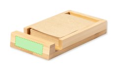 Portanotas de línea nature con soporte para smartphone integrado. Fabricado en bambú, incluye 80 notas adhesivas de acabado kraft. Presentado en caja individual de diseño kraft.