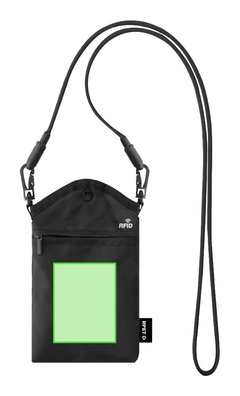 Portatodo fabricado en RPET. Compartimento principal con cierre de botón y bolsillo en la parte frontal con sistema de cierre en cremallera. Incluye sistema de protección RFID, diseñado para bloquear accesos no autorizados a tarjetas contactless.Cinta de transporte 2 en 1 unida mediante mosquetones con función de cable apto para transferir datos, con conexión Tipo C de 60W. Incluye distintivo logotipo RFID y RPET.