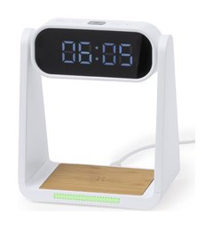 Reloj multifunción con pantalla retroiluminada, función lámpara y cargador inalámbrico 10W integrado. Fabricado en resistente ABS y bambú, de elegante diseño en color blanco, con funciones hora (12/24h) y alarma (3) . Pantalla con intensidad regulable, compatible con dispositivos equipados con tecnología de carga inalámbrica Qi y lámpara con 6 LEDs. Presentado en caja individual de diseño kraft y protector de papel, con manual de instrucciones en español en inglés. Elaborado con elementos vegetales para así fomentar la utilización de materias primas naturales y reducir las emisiones contaminantes.