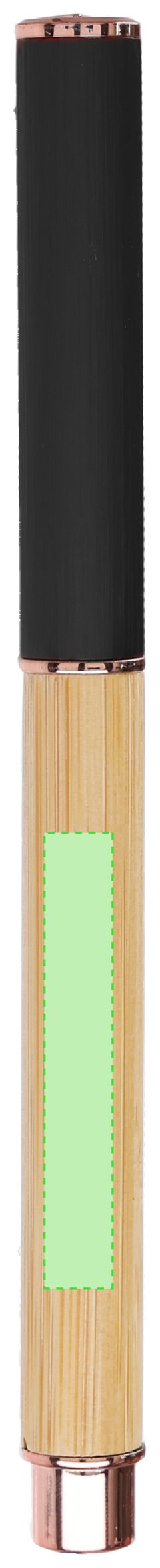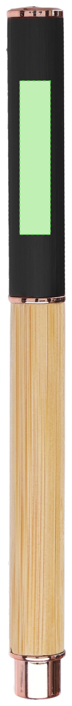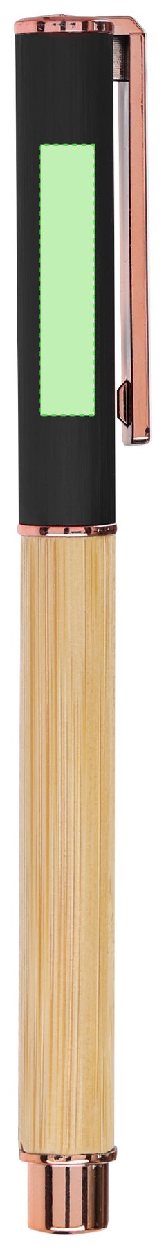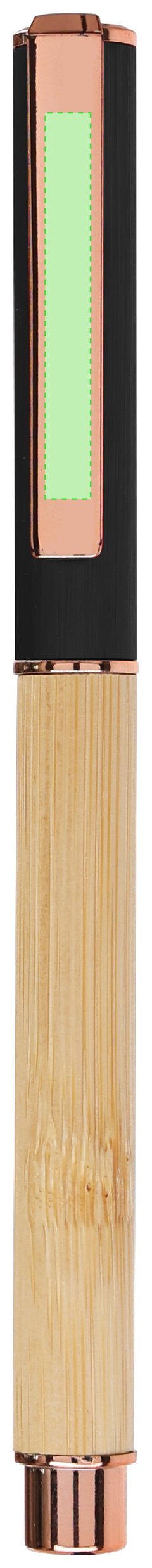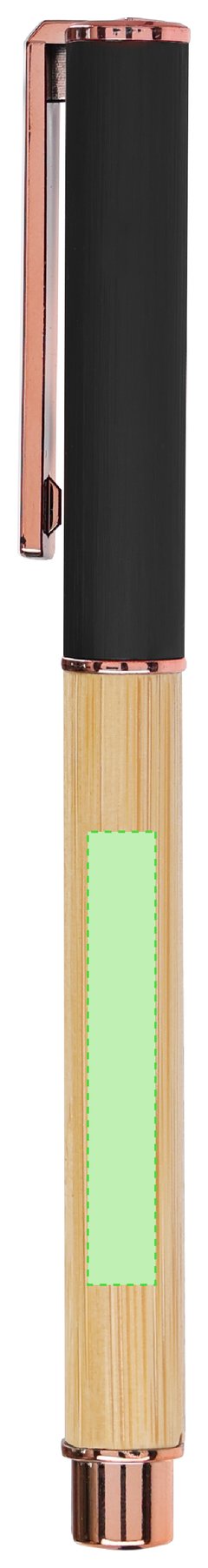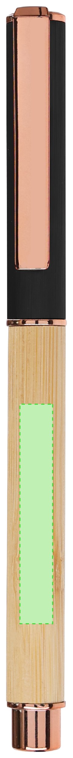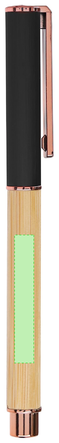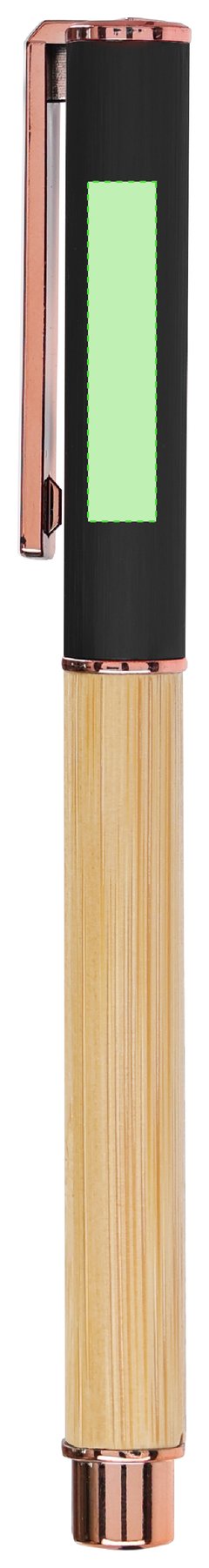 Elegante roller fabricado en bambú y aluminio. Con clip metálico, empuñadora y detalles de acabado oro rosa, caña fabricada en bambú y tapadera en aluminio. Con cartucho jumbo, en tinta azul y con cierre de capucha.