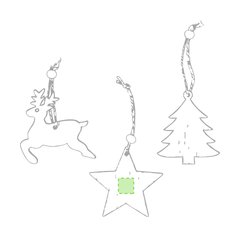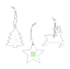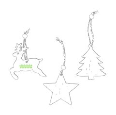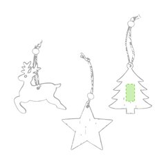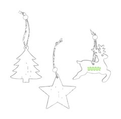 Set de 3 figuras navideñas de línea nature para colgar, fabricadas en madera de tacto suave. Cordón en yute con bolita para ajuste. Incluye reno, estrella y árbol de navidad. Presentado en bolsa individual con cartón interior en color natural.