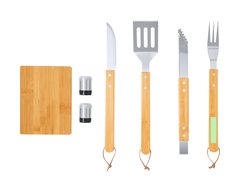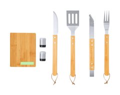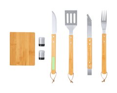Set de barbacoa elaborado en bambú y acero inox. Este conjunto incluye 7 accesorios de metal con mangos de bambú: 1 cuchillo, trinchador, pinzas, espátula, salero y pimentero, junto con una tabla de bambú para corte y presentación. El set se presenta de manera elegante en un estuche individual fabricado en resistente poliéster, con sujeciones elásticas interiores para los distintos utensilios. Materiales como el bambú fomentan la utilización de materias primas naturales, reduciendo las emisiones contaminantes. Proviene de una planta de gran resistencia y versatilidad, con crecimiento y regeneración rápidos, siendo una excelente alternativa al uso de madera tradicional.