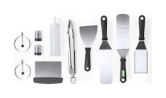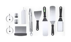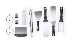 Set de barbacoa fabricado en acero inox. Consta de 11 accesorios, entre ellos: 1 espátula lisa, 2 espátulas con agujeros, 1 raspadora, 1 pinza, 1 espátula, 1 salero, 1 pimentero, 1 bidón con dosificador y 2 moldes redondos. Todo se presenta de manera organizada en un práctico macuto con cierre de cremallera y asas para facilitar su transporte. Presentado individualmente en bolsa reciclada.