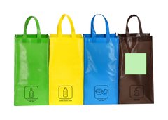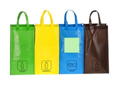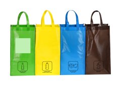 Set de 4 bolsas de reciclaje amarilla-verde-azul-marron en resistente Non-woven laminado de 125g/m2 de acabado brillante. Incluye 3 bolsas de 23x45x23cm unidas entre sí mediante resistentes velcros laterales. Con asas reforzadas e indicación de tipos de residuo: plástico y envases, orgánico, vidrio y papel.