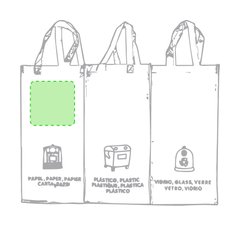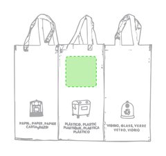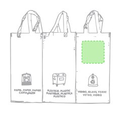 Set de 3 bolsas de reciclaje amarilla-verde-azul en resistente pp-woven laminado de 130g/m2 de acabado brillante. Incluye 3 bolsas de 23x45x23cm unidas entre sí mediante resistentes velcros laterales. Con asas reforzadas e indicación de tipos de residuo: plástico y envases, vidrio y papel.