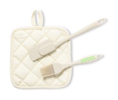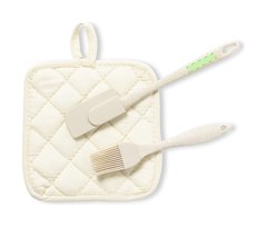Set de cocina de 3 piezas presentado en funda marrón con cordón de cierre. Incluye: Espátula y brocha de silicona en tono natural, con mangos troquelados en resistente PP veteado. Agarrador en 100% algódón de acabado natural, con cinta para colgar.