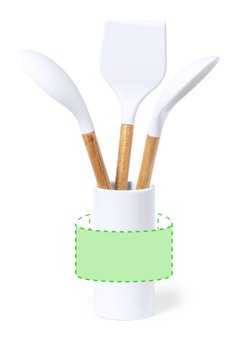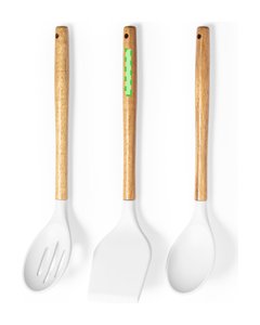Set de cocina de 3 piezas, con mango fabricado en madera de acacia natural y accesorios en silicona. Incluye cuchara, paleta y espumadera, con base de cerámica a juego. Presentación en caja individual de diseño kraft.
