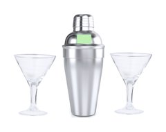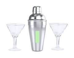 Elegante set de coctel. Conjunto de coctelera en acero inox de 550 ml para preparar las mejores mezclas de bebidas. Además, contiene 2 copas de cristal de 150 ml cada una y de elegante diseño triangular, para una presentación exquisita. Presentado en caja negra.
