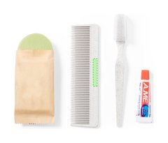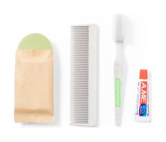 Set de aseo esencial con cepillo de dientes, pasta de dientes, peine y jabón. Contenido: Cepillo de dientes y peine fabricados en caña de trigo, para así fomentar la utilización de materias primas naturales y reducir las emisiones contaminantes. Pasta dentífrica en tubo de 6 gr, con tapón a rosca. Pastilla de jabón de 20 gr. Set presentado en caja individual de diseño kraft.