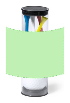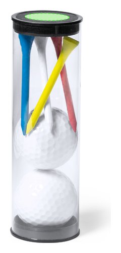 Completo set de golf de 6 accesorios. Incluye 2 pelotas blancas de doble capa y 4 tees de madera en colores amarillo, azul, blanco y rojo. Presentación en bote transparente con tapón.