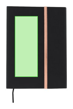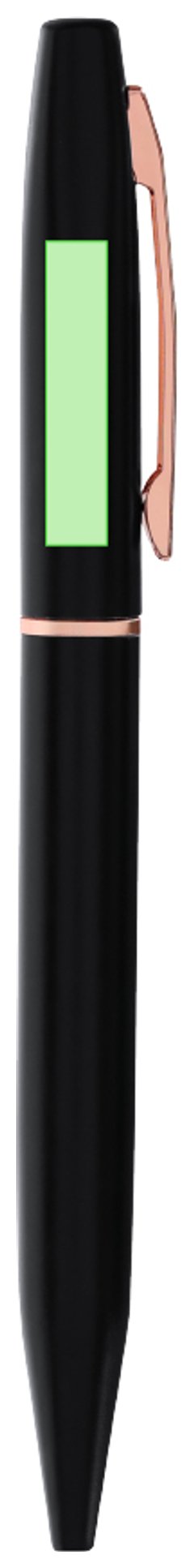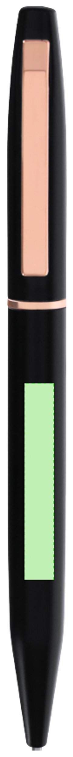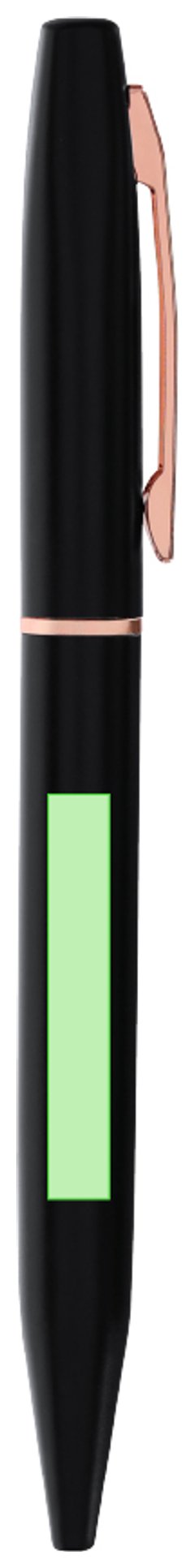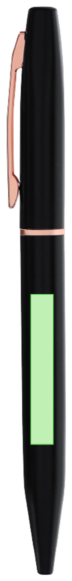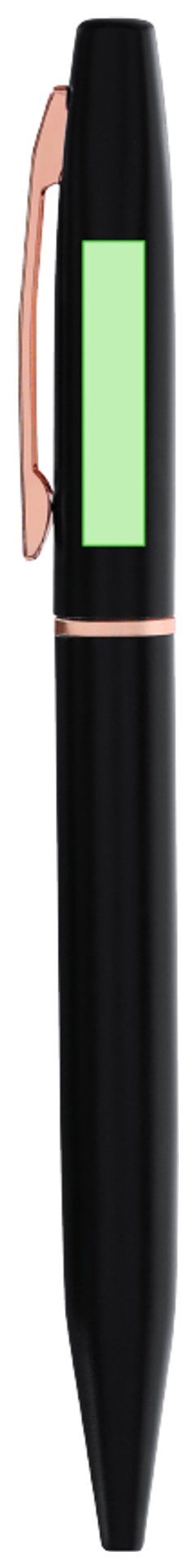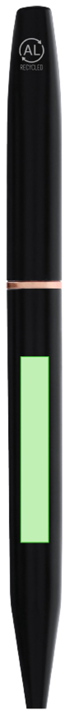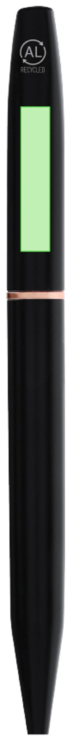 Set de bloc de notas y bolígrafo fabricados en PU Reciclado y Aluminio Reciclado. En elegante negro mate y con distinguidos accesorios en acabado oro rosa. El set incluye: - Bloc de notas fabricado en PU Reciclada y elegante detalle en oro rosado, con tapas rígidas y sistema de cierre imantado. Incluye 80 páginas de color crema con líneas, un marcapáginas a juego y soporte para bolígrafo. Con distintivo PU Reciclada. - Bolígrafo de aluminio reciclado, con cuerpo en color negro mate y detalles en acabado oro rosa. Dispone de clip metálico, mecanismo giratorio y tinta azul. Incluye distintivo de aluminio reciclado. Todo el conjunto se presenta en un elegante estuche negro.La PU Reciclada destaca por su resistencia y elasticidad. Este material reciclado y reciclable es una opción sostenible que rescata las fibras desechadas en los procesos de fabricación, minimizando así el desperdicio de material y contribuyendo a su vez a reducir el impacto ambiental, manteniendo a la vez sus propiedades originales.El Aluminio Reciclado es un material con posibilidades de reciclaje casi infinitas, sin perder sus propiedades originales y consumiendo menos energía en este proceso.Certificación GRS (Global Recycled Standard / Estándar de Reciclaje Global), que garantiza el origen reciclado del material usado para fabricar el producto.