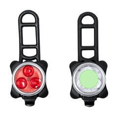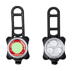 Kit de luces de seguridad para bicicleta fabricadas en silicona y ABS. Este conjunto consta de dos piezas: una luz blanca para el frontal y otra luz roja para la parte trasera, mejorando la visibilidad. Equipadas con tres potentes LEDs, que ofrecen 4 modos de iluminación: fijo de intensidad alta o media, e intermitente rápido o lento. Recargable gracias a su batería de 650 mAh de capacidad, con cable de carga incluido. Con accesorios de acople válidos para cualquier bicicleta y presentado en caja de diseño kraft.