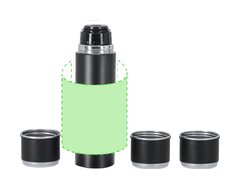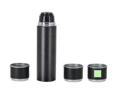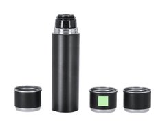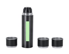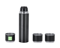 Set de termo con 3 tazas fabricado en acero inox. Termo de 420 ml de capacidad y de doble pared, que garantiza una mejor y más duradera conservación de la temperatura, con dosificador de seguridad. Tazas de 140ml, ajustables mediante rosca y en elegante diseño negro, ideales para disfrutar de la bebida, ya sea caliente o fría, en cualquier momento y lugar. Presentación en elegante estuche de color negro.