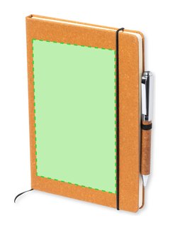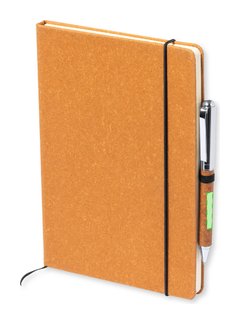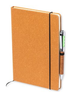 Set de bloc de notas y bolígrafo en cuero reciclado. Incluye: Bloc de notas con tapas rígidas fabricadas en cuero reciclado. Interior con 100 hojas de disposición a una raya. Incluye marcapáginas, elástico de cierre y soporte para bolígrafo a juego. Con distintivo cuero reciclado en contraportada. Bolígrafo fabricado en metal cromado y con cuerpo recubierto en cuero reciclado. Elegante clip metálico y accesorios a juego. De mecanismo giratorio y en tinta azul, con distintivo cuero reciclado en cuerpo. Set presentado en estuche individual de diseño kraft, con compartimento independiente para bloc de notas y bolígrafo. El cuero reciclado rescata las fibras desechadas en los procesos de fabricación del cuero, minimizando el desperdicio de material, contribuyendo a reducir el impacto ambiental y manteniendo a la vez sus propiedades originales.
