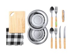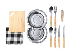 Original set de picnic de 2 servicios. Presentado en resistente funda 100% algodón de acabado natural, con cierre de cremallera y asa de transporte. Interior reforzado, con compartimentos para los diferentes accesorios. Contenido: 2 cucharas, 2 cuchillos y 2 tenedores en acero inox con mango de madera natural 2 platos en acero inox de 19,5 cm de diámetro. 2 servilletas en tela de 30 x 30 cm. Con diseño retro en patrón a cuadros y en combinación tonos negros, grises y blancos. Sacacorchos en acero inox, con navaja integrada y mango de madera natural Tabla de corte y presentación de 15 x 15 cm, en madera natural y con asa troquelada.