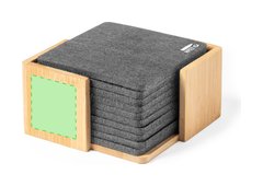 Set de 10 posavasos de línea nature. Fabricados en fieltro RPET reciclado, fruto de la combinación del proceso de reciclaje de materiales plásticos junto con la técnica milenaria de fabricación del fieltro, dando como resultado un material de eco-tendencia que, además de ser de origen reciclado, también se convierte en reciclable. Soporte fabricado en bambú y posavasos con distintivo RPET. Set presentado en caja individual de diseño kraft.