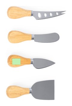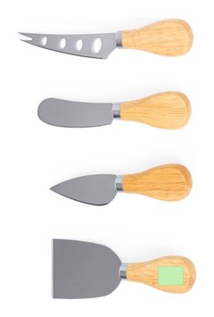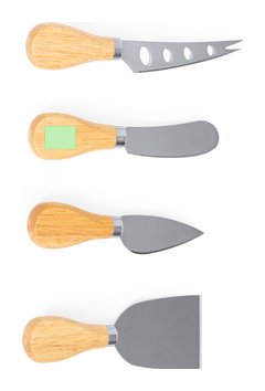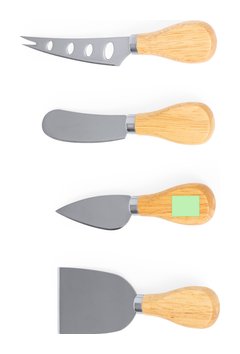 Set de quesos fabricado en madera. Utensilios fabricados en acero inox y mango de madera, con cuatro modelos diferentes: para quesos duros, quesos blandos, quesos semiduros y quesos en trozos. Presentados en original estuche de cartón reciclado, con interior troquelado para cada accesorio.