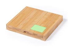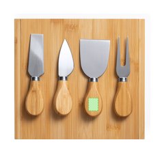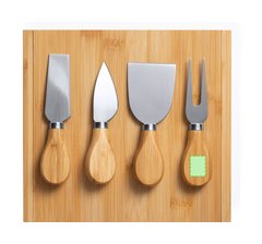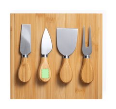 Original set de quesos en caja plegable con troquelado interior para cada accesorio y en formato rectangular. Accesorios en acero inox con mango en bambú. Presentado en caja individual de diseño kraft.