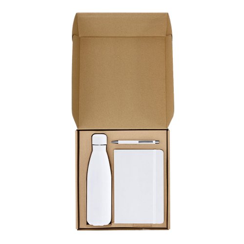 Set de bloc de notas y bolígrafo, además de un bidón térmico fabricado en acero inox.El set incluye:- Bloc de notas de PU de tapas rígidas y suaves, con 80 páginas a rayas, banda elástica y marcapáginas a juego.- Bolígrafo de aluminio en acabado frosted y detalles en color metalizado gun, mecanismo pulsador y tinta azul.- Bidón térmico fabricado en acero inox de 500ml. Con tapón a rosca.