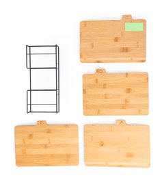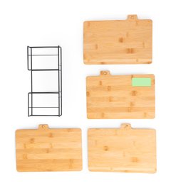 Conjunto de tablas de corte fabricadas en bambú, cada una fácilmente identificable por los dibujos tallados específicamente para pescado, carne blanca, carne roja y verduras. Incluye una cesta metálica con guías para un almacenamiento ordenado. Presentado en caja de diseño kraft. Materiales como el bambú fomentan la utilización de materias primas naturales, reduciendo las emisiones contaminantes. Proviene de una planta de gran resistencia y versatilidad, con crecimiento y regeneración rápidos, siendo una excelente alternativa al uso de madera tradicional.