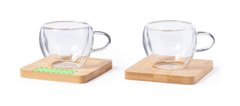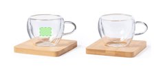 Set de 2 tazas de doble pared y 90 ml de capacidad. Fabricadas en cristal de borosilicato, que ofrece una resistencia y durabilidad excepcionales, alargando su vida útil y pudiendo ser reutilizado infinidad de veces. Incluidos 2 posavasos en bambú, con troquelado en la base para ajuste perfecto de cada taza. Set presentado en estuche de diseño en cartón kraft, con compartimento individual para cada taza.