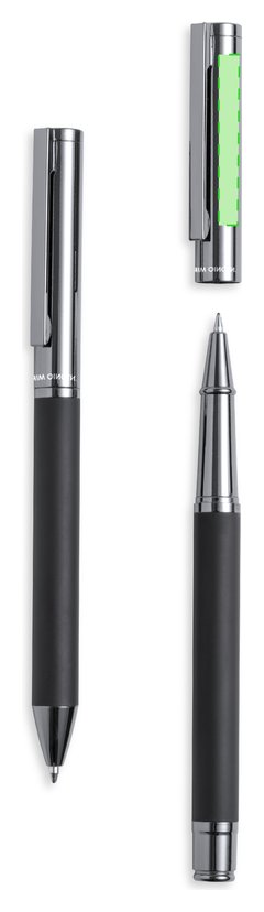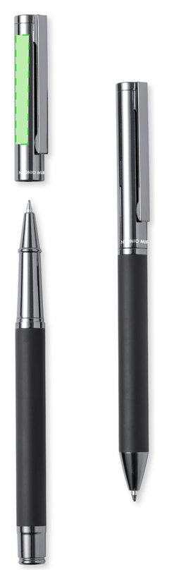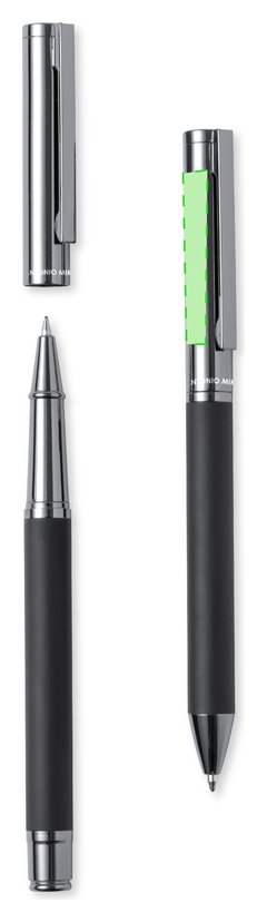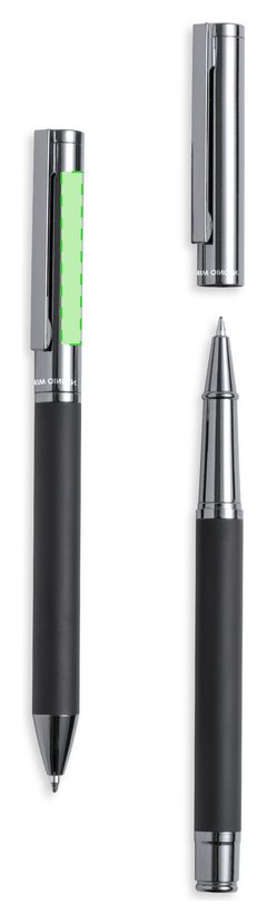 Set de bolígrafo y roller de Antonio Miró. Incluye: Bolígrafo metálico con cuerpo en negro mate. Detalles y capucha en cromado con logotipo de la marca; cartucho jumbo y en tinta azul. Roller metálico con cuerpo en negro mate. Detalles y capucha en cromado con logotipo de la marca. Cartucho jumbo y en tinta azul. Presentado en elegante y resistente estuche individual negro con logotipo Antonio Miró, cierre magnético y funda de protección a juego.