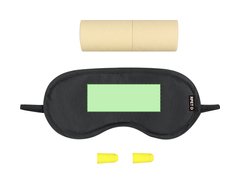 Set de viaje con antifaz y tapones para oídos. Antifaz en suave y confortable RPET con elástico de ajuste a juego, con distintivo en etiqueta. Tapones en confortable material EVA de color amarillo. Presentado en práctico estuche cilíndrico en cartón kraft. El material RPET se elabora a partir de plástico reciclado, para así fomentar la reutilización de residuos plásticos y ayudar a la sostenibilidad del planeta.