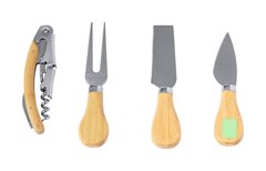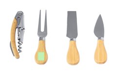 Set de quesos y vino con accesorios fabricados en resistente acero inox, con mango en bambú. Accesorios presentados en un original estuche de cartón corrugado, con interior troquelado para cada uno. Incluye utensilios para quesos duros, blandos y troceados; y un abridor de dos tiempos con cuchilla cortacápsulas. Materiales como el bambú fomentan la utilización de materias primas naturales, reduciendo las emisiones contaminantes. Proviene de una planta de gran resistencia y versatilidad, con crecimiento y regeneración rápidos, siendo una excelente alternativa al uso de madera tradicional.