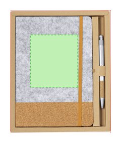 Set de bloc de notas y bolígrafo confeccionados en fieltro RPET y Aluminio Reciclado. Incluye un bloc de notas de tapas rígidas, elaboradas en fieltro RPET y corcho natural, con 80 páginas lisas, banda elástica, marcapáginas y un elástico para sujetar bolígrafos de color marrón. Además, cuenta con un bolígrafo de Aluminio Reciclado con empuñadura de corcho natural, mecanismo pulsador y tinta azul. Se presenta de manera elegante en una caja de presentación. El fieltro RPET es fruto de la combinación del proceso de reciclaje de materiales plásticos junto con la técnica milenaria de fabricación del fieltro, dando como resultado un material de eco-tendencia que, además de ser de origen reciclado, también se convierte en reciclable.