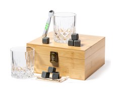 Set de whisky en elegante estuche de bambú con interior troquelado. Incluye 2 vasos de cristal de 320 ml, pinzas y 8 cubitos en piedra natural reutilizables, con funda de algodón. Presentación en caja individual de diseño kraft. Los cubitos reutilizables están fabricados en piedra natural esteatita, también conocida como piedra o roca de jabón, que mantiene la bebida fría sin alterar sus propiedades al no diluir su contenido en agua, además de mantener el sabor original de la misma.