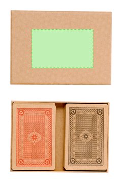 Set de baraja española y baraja francesa, fabricadas en resistente cartón reciclado. Baraja española con 50 naipes y baraja francesa con 54 naipes, presentadas en estuche de cartón acabado kraft con tapadera.