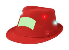Sombrero confeccionado en poliéster con luces LEDs multicolor distribuidas por toda la superficie, con tres modos de iluminación (fijo, parpadeo lento y parpadeo rápido). Funciona con pilas de botón -incluidas- y cuenta con un discreto botón on/off en el lateral.