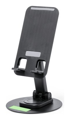 Soporte plegable para smartphone y tablet, fabricado en resistente aluminio y ABS. Regulable en altura, con almohadillas de goma antideslizantes en base y soporte. En sobrio acabado de color blanco o negro, y con amplia superficie de marcaje. Presentado en atractiva caja de diseño.