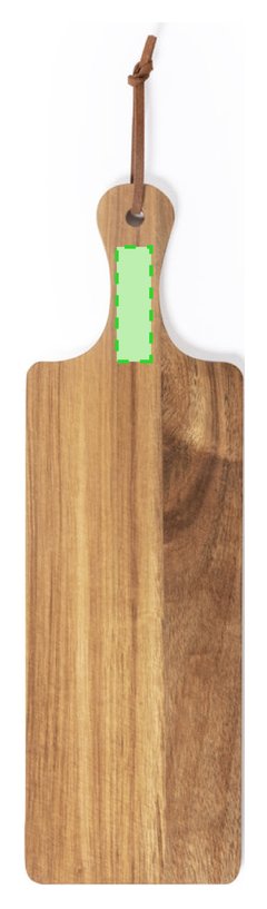 Tabla de corte y presentación fabricada en madera natural. En formato rectangular, con asa y cordón en resistente polipiel a juego.