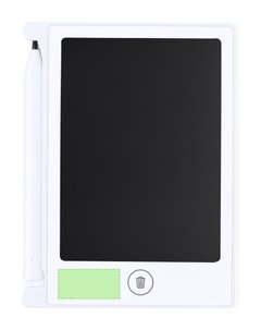 Tableta LCD para escritura en resistente material, con fijación magnética y soporte para el lápiz. Pantalla LCD de 4,5 pulgadas, con lápiz incluido, botón de borrado, bloqueo anti borrado y pila de botón incluida. Presentado en caja de diseño kraft.