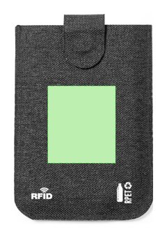 Elegante tarjetero fabricado en poliéster RPET de acabado en color negro. Con cierre imantado, capacidad para 5 tarjetas y mecanismo de extracción tirando de la cinta de cierre. Con tecnología de seguridad RFID (Identificación por Radio Frecuencia) que mantiene seguros tus dispositivos de transmisión de identidad. Distintivos RPET y RFID en el exterior. El material RPET se elabora a partir de plástico reciclado, para así fomentar la reutilización de residuos plásticos y ayudar a la sostenibilidad del planeta.