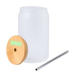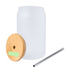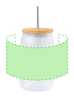 Tarro de sublimación con cuerpo fabricado en resistente cristal mate, con 400 ml de capacidad. Tapa en bambú a presión con orificio para pajita (pajita incluida y fabricada en acero inox). Especialmente diseñada para marcaje en sublimación. Presentada en caja individual kraft.