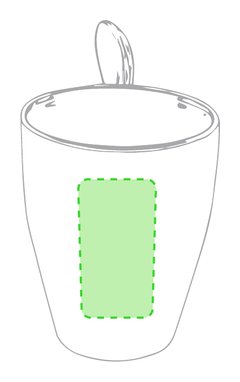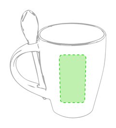 Taza de cerámica de 350ml de capacidad en divertida combinación de exterior en color blanco e interior en gama de vivos colores. Con cuchara de cerámica a juego integrada en asa y presentada en caja individual.