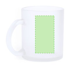Taza de cristal de 350ml de capacidad, de acabado translúcido y especialmente diseñada para marcaje en sublimación. Presentada en caja individual de diseño kraft.