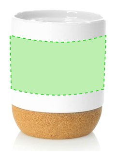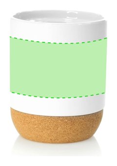 Taza de cerámica de 420ml de capacidad, especialmente diseñada para marcaje en sublimación. De acabado mate, con base en corcho natural y presentada en caja individual de diseño kraft.